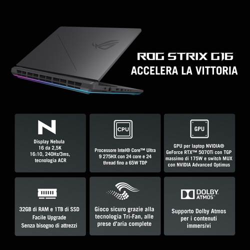 Lista Prezzi - Scheda del prodotto ASUS ROG Strix G16 G615LR-S5139W Intel Core Ultra 9 275HX Computer portatile 40,6 cm (16'') WQXGA 32 GB DDR5-SDRAM 1 TB SSD NVIDIA GeForce RTX 5070 Ti Wi