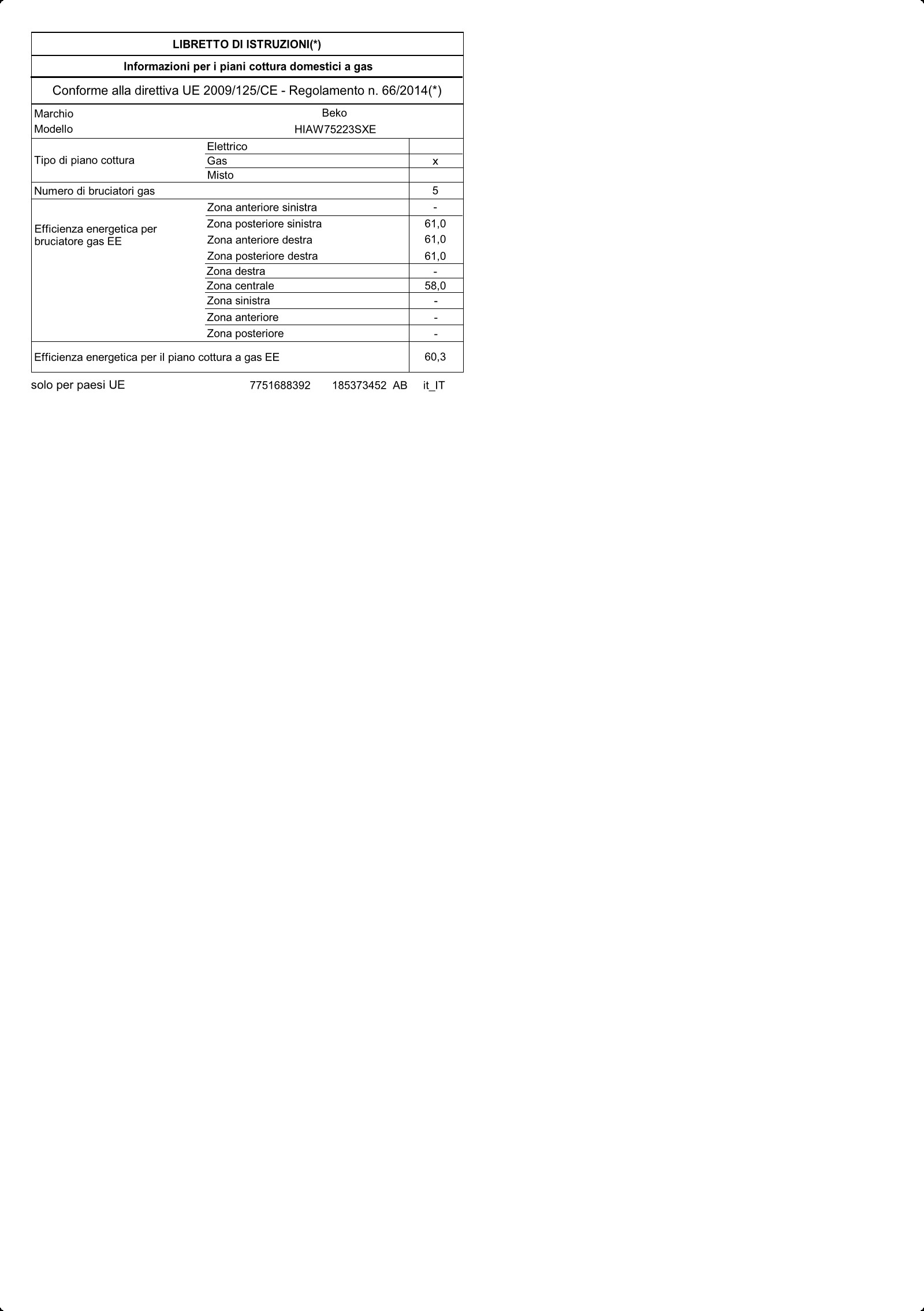 | - Tipo di fornello/zona cottura 1: