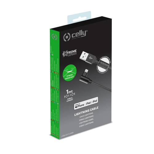 Cavo dati USB ultra resistente con connettore a L, lunghezza 1 metro, dotato di connettore Lightning con certificazione MFi “Made for iPod, iPhone, iPad”.