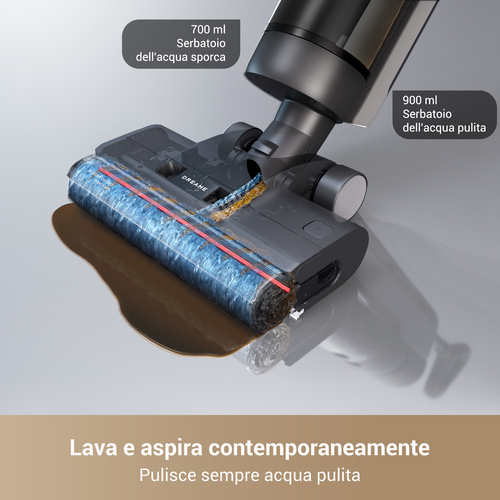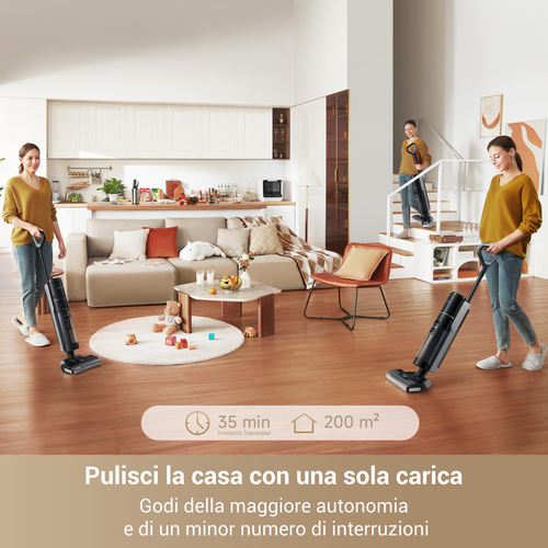 Con il serbatoio dell’acqua pulita da 900 ml e quello dell’acqua sporca da 700 ml, Dreame G10VIU Pro consente sessioni di pulizia prolungate senza frequenti ricariche. La batteria ad alta capacità offre fino a 35 minuti di autonomia, ideale per pulire superfici domestiche ampie con una sola ricarica.