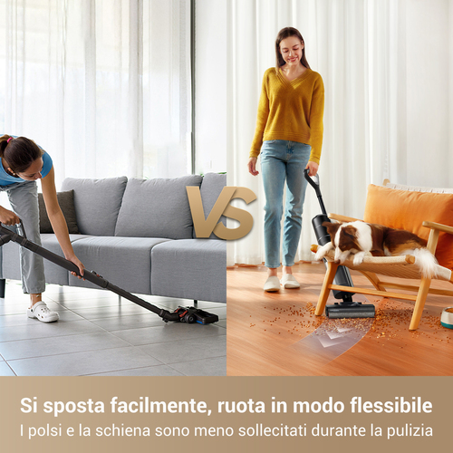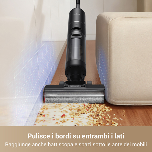 Il sistema di pulizia automatica della spazzola con un solo tocco semplifica la manutenzione: basta posizionare il dispositivo sulla base e avviare il ciclo per lavare il rullo in meno di 3 minuti, rendendolo subito pronto per l’utilizzo successivo. Il display LED integrato fornisce in tempo reale informazioni su modalità di utilizzo, autonomia residua e stato del dispositivo.