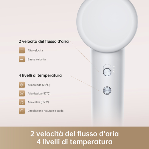 L'asciugacapelli offre anche versatilità grazie a due velocità del flusso d'aria e quattro livelli di temperatura, che consentono agli utenti di personalizzare l'esperienza di asciugatura e styling in base alle proprie esigenze. La modalità di circolazione naturale e calda è una caratteristica particolarmente notevole, offrendo la possibilità di alternare tra aria calda e fredda per uno styling più dinamico e per ridurre ulteriormente il rischio di danni ai capelli.