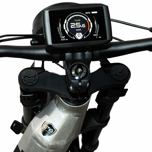 I freni a disco idraulici da 180/160 mm della bicicletta elettrica di EMG garantiscono un controllo preciso della velocità in qualsiasi situazione, mentre il display color LCD fornisce informazioni cruciali sullo stato della bicicletta e della batteria. E, per una guida sicura anche di note, è equipaggiata di un potente faro LED hi-light anteriore e una luce posteriore LED, mentre i parafanghi in carbon look proteggono dai detriti e dallo sporco.