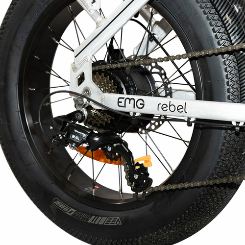 Rebel MWC di EMG è una fat bike elettrica all-terrain progettata per offrire prestazioni elevate e affidabilità su qualunque tipo di terreno. Con il suo robusto telaio in alluminio 6061 e una forcella ammortizzata a doppio stelo, conquisterà qualsiasi sfida gli si presenti.