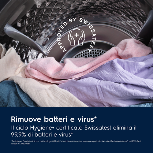 Il ciclo Hygiene certificato da Swissatest, funziona sopra i 60°C, asciugando e disinfettando gli indumenti rimuovendo il 99.9% di virus e batteri.