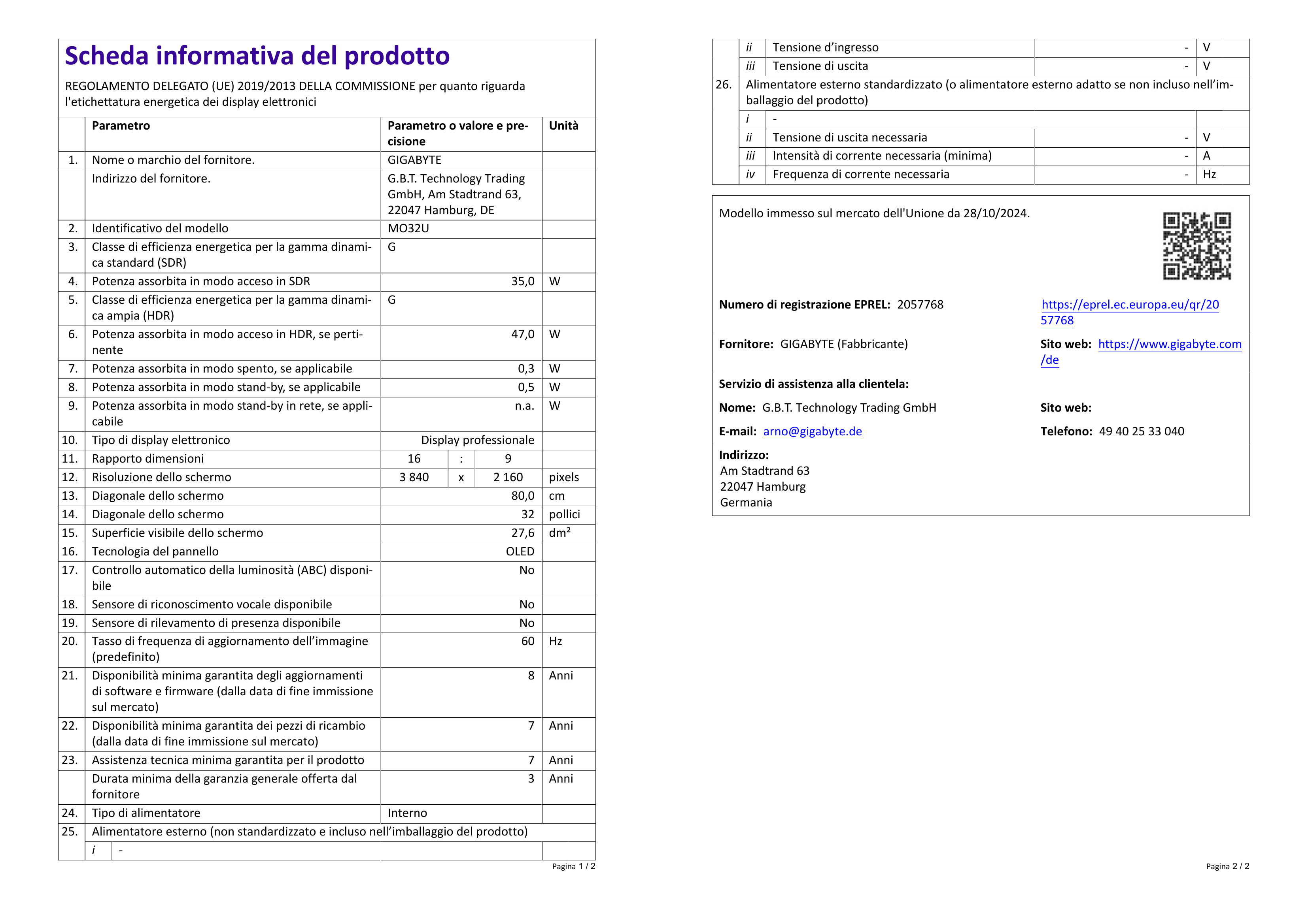 Lista Prezzi - Scheda del prodotto GIGABYTE MO32U 31,5'' Monitor Gaming OLED 4K UHD - 3840 x 2160, 165Hz, 0.03ms, 250 cd/m², Display HDR True Black 400, HDMI 2.1, DisplayPort 1.4