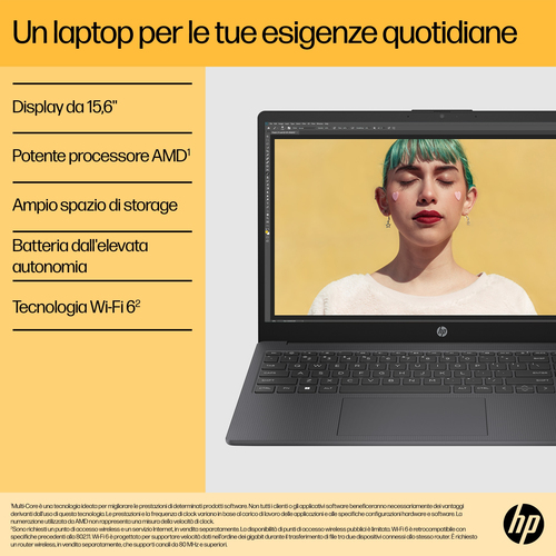 Il PC laptop HP da 15,6" è ricco di funzionalità ed è la scelta perfetta per ogni budget, oltre ad essere più sostenibile per il pianeta. Costruito con materiali riciclati, questo potente laptop HP è dotato di processore AMD[1], ampio spazio di archiviazione e una grafica avanzata. Inoltre, il rapporto screen-to-body dell’85%[2] e la sottile cornice su tre lati offre tantissimo spazio per una visualizzazione straordinaria.