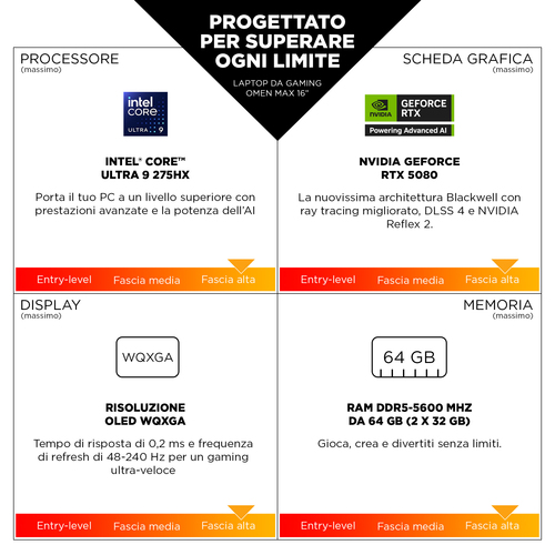 Il laptop da gaming OMEN 16 MAX offre prestazioni impareggiabili, a casa o in movimento. Con le GPU NVIDIA di nuova generazione e le CPU Intel Core™ Ultra[1], una nuova modalità Unleashed per l'overclocking manuale e un'architettura termica creata per ridurre sia il throttling che l'usura a lungo termine, i gamer appassionati potranno dare il meglio di sé per molti anni a venire.