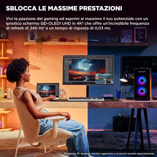 Regalati una qualità d'immagine incredibile e un gameplay velocissimo, con il monitor da gaming OMEN Transcend 32 OLED. Crea e gioca come mai prima d'ora, con un monitor QD-OLED UHD in 4K[2] che garantisce colori precisi e offre una frequenza di refresh di 240 Hz[1] con tempo di risposta di 0,03 ms. Con OMEN Gear Switch e una porta USB-C che eroga alimentazione a 140 W, puoi passare in un attimo dal divertimento al lavoro... e viceversa!