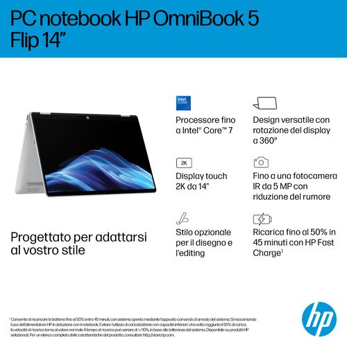Image of        HP OmniBook 5 Flip 14-fp0009nl Intel Core 5 120U Ibrido (2 in 1) 35,6 cm (14'') Touch screen 2K 16 GB LPDDR5-SDRAM 512 GB SSD Wi-Fi 6 (802.11ax) Window