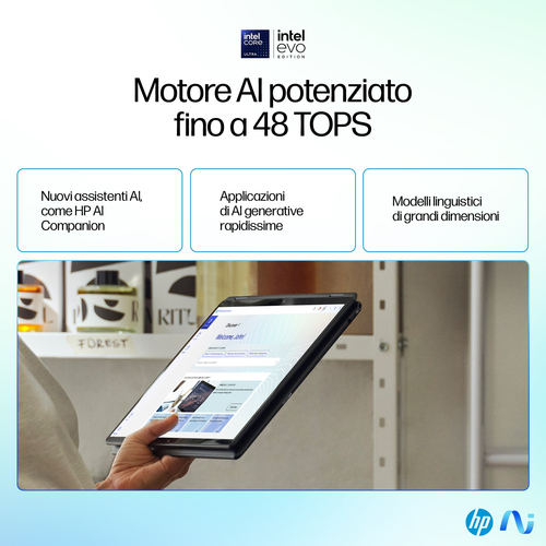 HP OmniBook Ultra Flip regala potenza, versatilità e stile. Libera la tua creatività con il nuovissimo processore Intel® Core™ Ultra che accelera le operazioni AI[1]. Con gli strumenti riservati e sicuri basati sull'AI e una batteria che dura ancora più a lungo[2], puoi fare sempre di più in meno tempo. Il tutto sapendo che il tuo PC è protetto dalla versione consumer di HP Wolf Security.