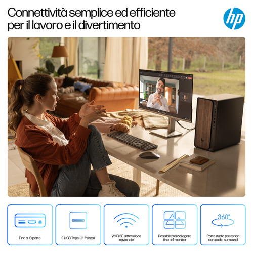 Il PC desktop HP OmniDesk basato su AI offre efficienza e prestazioni ottimali per le attività quotidiane più impegnative. Basato sul processore Intel Core™ Ultra[1] con tecnologia AI integrata, questo PC potenzia la produttività quotidiana con le porte più recenti, ampio spazio di storage e memoria DDR5 per tempi di avvio più rapidi.