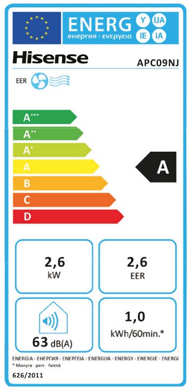Hisense APH09NJ, Condizionatore portatile monoblocco, Raffreddamento, Deumidificazione, Riscaldamento, 2600 W, 2400 W, 1 l/h, 52 dB