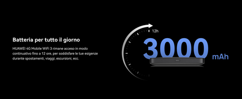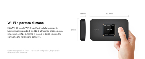 Scopri HUAWEI 4G Mobile WiFi 3: la tua rete Wi-Fi personale, ultraportatile e ad alta velocità. Porta una connessione potente ovunque ti porti il tuo stile di vita. Viaggia alla massima velocità con download fino a 300 Mbps. Grazie alla connessione 4G Cat. 7, guarda streaming in HD, gioca online senza lag e scarica file di grandi dimensioni in un lampo, ovunque ti trovi una rete cellulare. Wi-Fi Dual-Band intelligente per una connessione stabile e senza interferenze. Scegli la banda veloce a 5 GHz per prestazioni ottimali, o quella a 2,4 GHz per una copertura più ampia. Connetti fino a 32 dispositivi simultaneamente – smartphone, laptop, tablet – e condividi Internet in modo fluido con amici, familiari o colleghi. Design compatto e leggero, pensato per la mobilità. Con le dimensioni compatte e un peso di soli 127 g, HUAWEI 4G Mobile WiFi 3 scivola comodamente in tasca. Basta inserire una scheda SIM per navigare immediatamente: la compatibilità con gli operatori di oltre 100 paesi, testata sul campo, ti garantisce connettività in tutto il mondo.Tutto il controllo nella tua mano con l'app HUAWEI AI Life. Gestisci la tua rete mobile digitalmente e senza sforzo: imposta limiti di traffico, crea una rete guest, monitora i dispositivi connessi e assicura la protezione della tua rete, tutto direttamente dal tuo smartphone. Batteria di alta qualità da 3,000 mAh per un'intera giornata di connessione. Con un'autonomia di fino a 12 ore di utilizzo continuativo, HUAWEI 4G Mobile WiFi 3 ti accompagna dal mattino alla sera senza bisogno di ricarica. La batteria è rimovibile per una sostituzione facile e una durata ancora maggiore del prodotto.