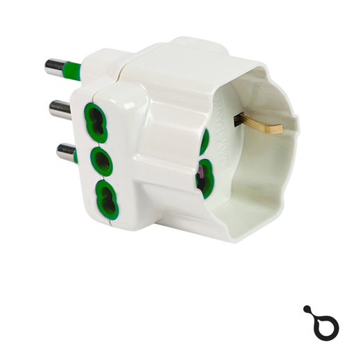 Adattatore triplo spina italiana 2P+T 16A 2 prese bipasso italiane 2P+T 16A 1 presa bipasso italo/tedesca 2P+T 16A.