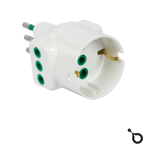 Adattatore triplo spina italiana 2P+T 10A 2 prese italiane 2P+T 10A 1 presa italo/tedesca 2P+T 16A.