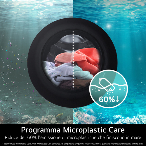Forse non lo sai, ma ogni volta che lavi un capo composto da fibre sintetiche vengono rilasciate delle microplastiche derivanti dallo sfregamento dei tessuti. Microplastiche che finiscono nel mare con le acque di scarico e che, inevitabilmente, vengono mangiate anche dai pesci. Con il programma Microplastic Care, la nostra lavatrice utilizza dei movimenti specifici del cestello per ridurre l'emissione delle microplastiche del 60%. Perché il nostro obiettivo è di offrirti un lavaggio ottimale per i tuoi capi, ma anche quello di preservare il pianeta su cui viviamo.