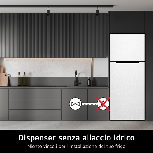Questo frigorifero integra un pratico distributore di acqua fresca, per dissetarti quando vuoi nelle giornate più calde o dopo un po' di attività fisica. Per versare dell'acqua fresca ti basta posizionare un bicchiere sotto al beccuccio e premere il tasto di erogazione. Il frigorifero non necessita di allaccio alla rete idrica: ti basterà riempire la tanica interna.