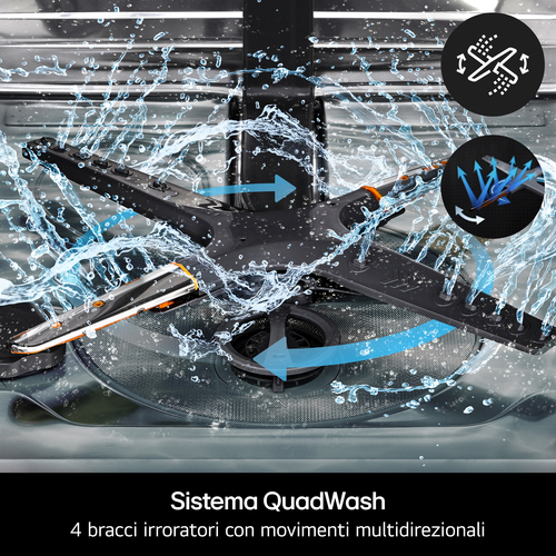 Sistema QuadWash: LG ha studiato un sistema di lavaggio unico nel suo genere, composto da ben 4 bracci irroratori con movimenti multidirezionali. Grazie a questo sistema, l'acqua viene spruzzata sulle stoviglie in maniera più precisa ed efficace, permettendole di raggiungere ogni angolo di piatti, pentole e bicchieri per ottenere un lavaggio profondo e accurato.