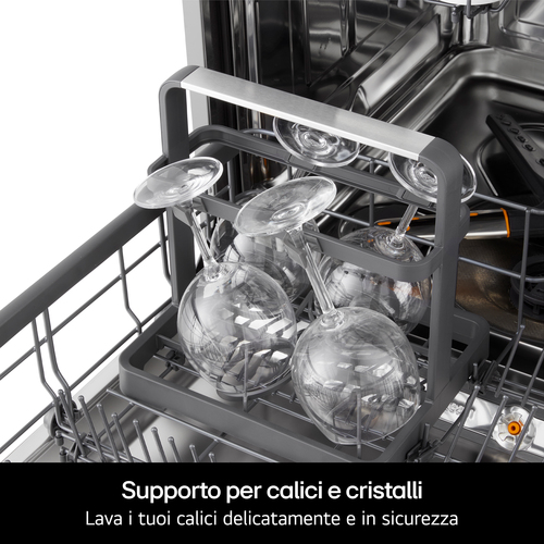 Il supporto dedicato, che puoi posizionare nel cestello inferiore della lavastoviglie, mantiene i calici fermi durante il ciclo e ti consente di lavare in modo sicuro anche i pezzi più delicati e fragili, evitando urti e vibrazioni che potrebbero incrinarli e danneggiarli.