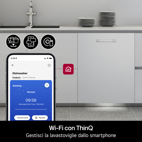 Collega la lavastoviglie al Wi-Fi di casa e scarica l'app LG ThinQ sul tuo smartphone per gestirla comodamente dal tuo smartphone. Puoi scaricare nuovi programmi di lavaggio e perfino configurare le opzioni di pulizia. Inoltre, dopo 30 cicli di lavaggio riceverai un avviso che ti ricorderà di effettuare la pulizia della lavastoviglie tramite l'apposito programma, in modo da mantenere le prestazioni sempre al top.