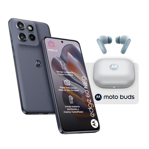 Ti presentiamo Motorola Edge 60 Neo, dal design compatto ed elegante e con protezione avanzata di livello militare. Scatta immagini eccezionali ovunque grazie al sistema di fotocamere Sony LYTIA™ 700C da 50 MP potenziato da Moto AI. Goditi i contenuti sullo schermo Super HD da 6,4", ultra luminoso. La ricarica TurboPower™ da 68W fornisce autonomia rapidamente. Fai spiccare ogni dettaglio con Motorola Edge 60 Neo con l’aggiunta di moto buds. Gli auricolari con ampio driver dinamico e audio ad alta risoluzione che esaltano la qualità di ogni suono. Lasciati avvolgere dai tuoi film e brani musicali preferiti con audio bilanciato di alta qualità e bassi ancora migliori. Escludi il mondo attorno a te o mantieni la percezione dell'ambiente che ti circonda durante l'ascolto con l'eliminazione attiva e dinamica del rumore. Goditi chiamate vocali nitidissime grazie al sistema con tre microfoni su ogni auricolare. Configura, personalizza e controlla la tua esperienza di ascolto in tutta semplicità. La differenza si sente forte e chiaro con moto buds.