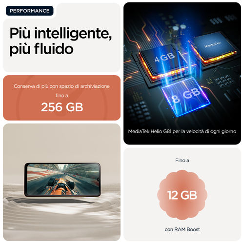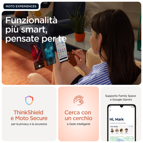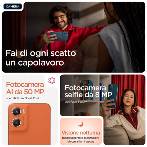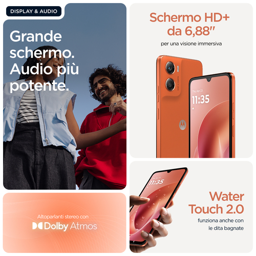 Ecco moto g06, un telefono progettato per andare oltre le tue aspettative. Guarda i tuoi programmi e film preferiti su un ampio e luminoso display 6,88", il nostro più grande di sempre su moto g, con altoparlanti stereo e audio Dolby Atmos®. Scatta foto straordinarie con qualsiasi condizione di luce utilizzando un sistema di fotocamere da 50 MP con tecnologia AI.(1) Ottieni multitasking super efficiente con fino a 12 GB di RAM utilizzando RAM Boost.(2,5,6,10) Goditi la tranquillità grazie alle caratteristiche di resistenza avanzata e a un design premium, che include la protezione dall'acqua IP64(3), Corning® Gorilla® Glass 3 e finitura in materiale premium vegano. Goditi 2 giorni con una singola ricarica.(4) E vivi esperienze Moto esclusive che rendono il tuo telefono più sicuro, personale e divertente. Inoltre, cerca immediatamente tutto ciò che vedi sul tuo telefono con Cerchia per cercare. Ottieni di più con moto g06.