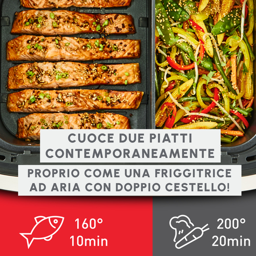 Usa la GiantZone per cucinare pasti abbondanti e porzioni generose fino a 8 persone. Puoi anche creare due zone e cucinare ingredienti separati con controllo del tempo e della temperatura individuale. Proprio come una friggitrice ad aria con doppio cestello.