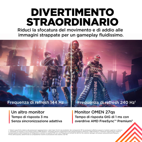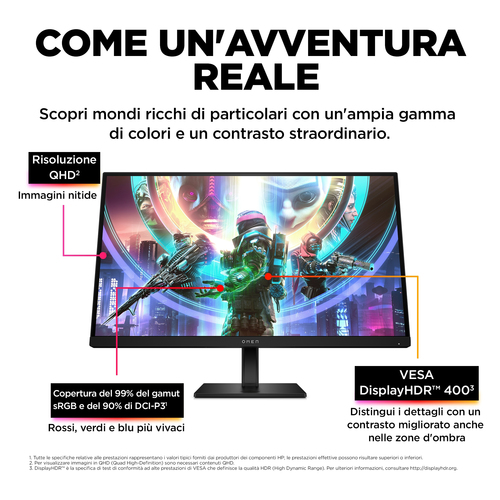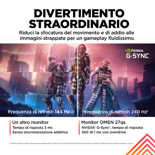 Con il monitor da gaming OMEN by HP da 27'', con display QHD a 240 Hz, i tuoi avversari non hanno alcuna possibilità. Questo monitor compatibile con la tecnologia NVIDIA® G-SYNC® offre una visione incredibilmente fluida e dettagli nitidissimi[1], per consentirti di dare il massimo. Con un design incredibilmente raffinato, offre una combinazione unica di velocità e stile per un'esperienza eccezionale dentro e fuori dal gioco.