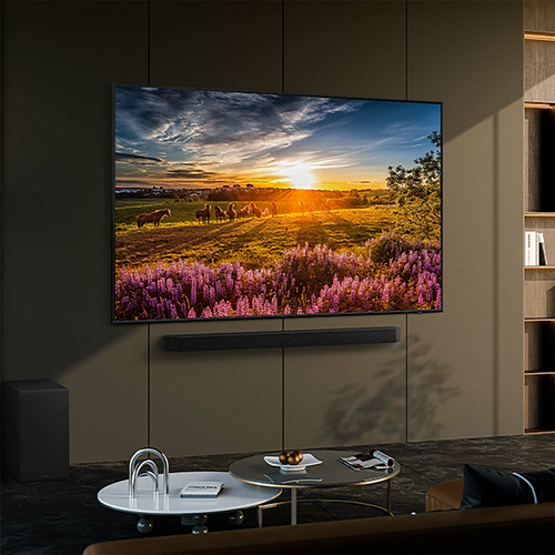 Il TV e la soundbar si integrano tra loro per produrre un suono avvolgente e perfettamente armonico Con la tecnologia Q-Symphony, gli altoparlanti del TV e della soundbar vengono utilizzati contemporaneamente senza disattivarli, per un perfetto audio surround.