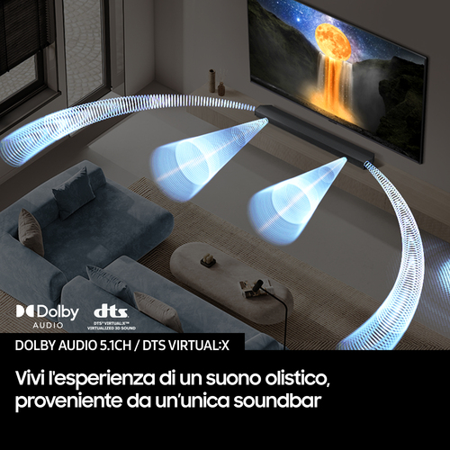 Contenuti mai così realistici con un affascinante palcoscenico sonoro in 3D. Le tecnologie Dolby Digital a 5.1 canali e DTS Virtual:X riproducono i suoni in ogni direzione per un'esperienza audio multidimensionale.