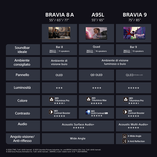 "(1) Prodotti home theatre compatibili: BRAVIA Theatre Quad, BRAVIA Theatre Bar 9, BRAVIA Theatre Bar 8. La funzione sarà disponibile tramite un futuro aggiornamento del firmware.