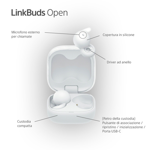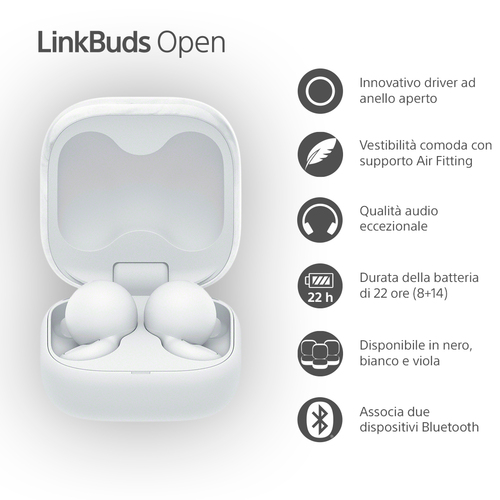 Scopri un nuovo tipo di auricolari, con un design ad anello che ti permette di udire i suoni importanti provenienti dall'ambiente circostante. I nuovi supporti ad aria per LinkBuds Open, leggeri e confortevoli, offrono un comfort per tutto il giorno. Disponibile in una gamma di colori abbinabili al tuo stile.